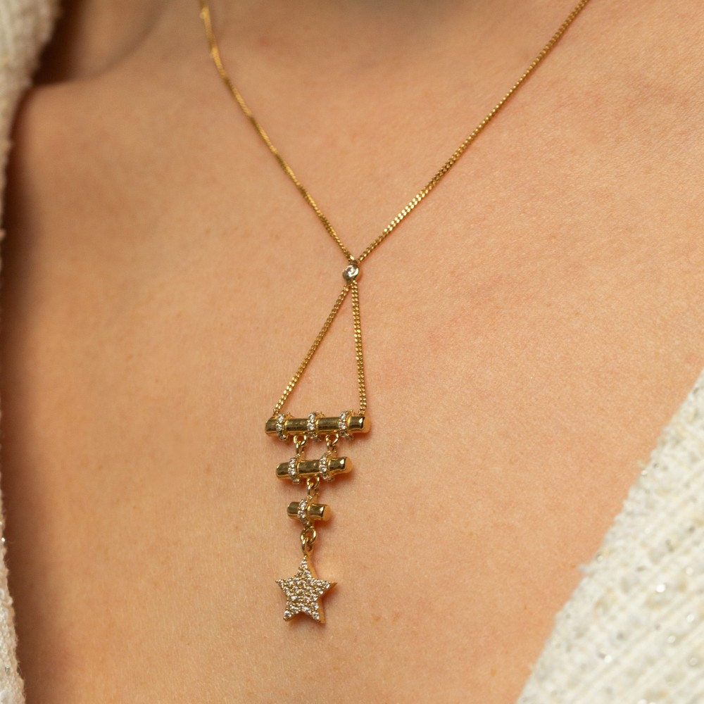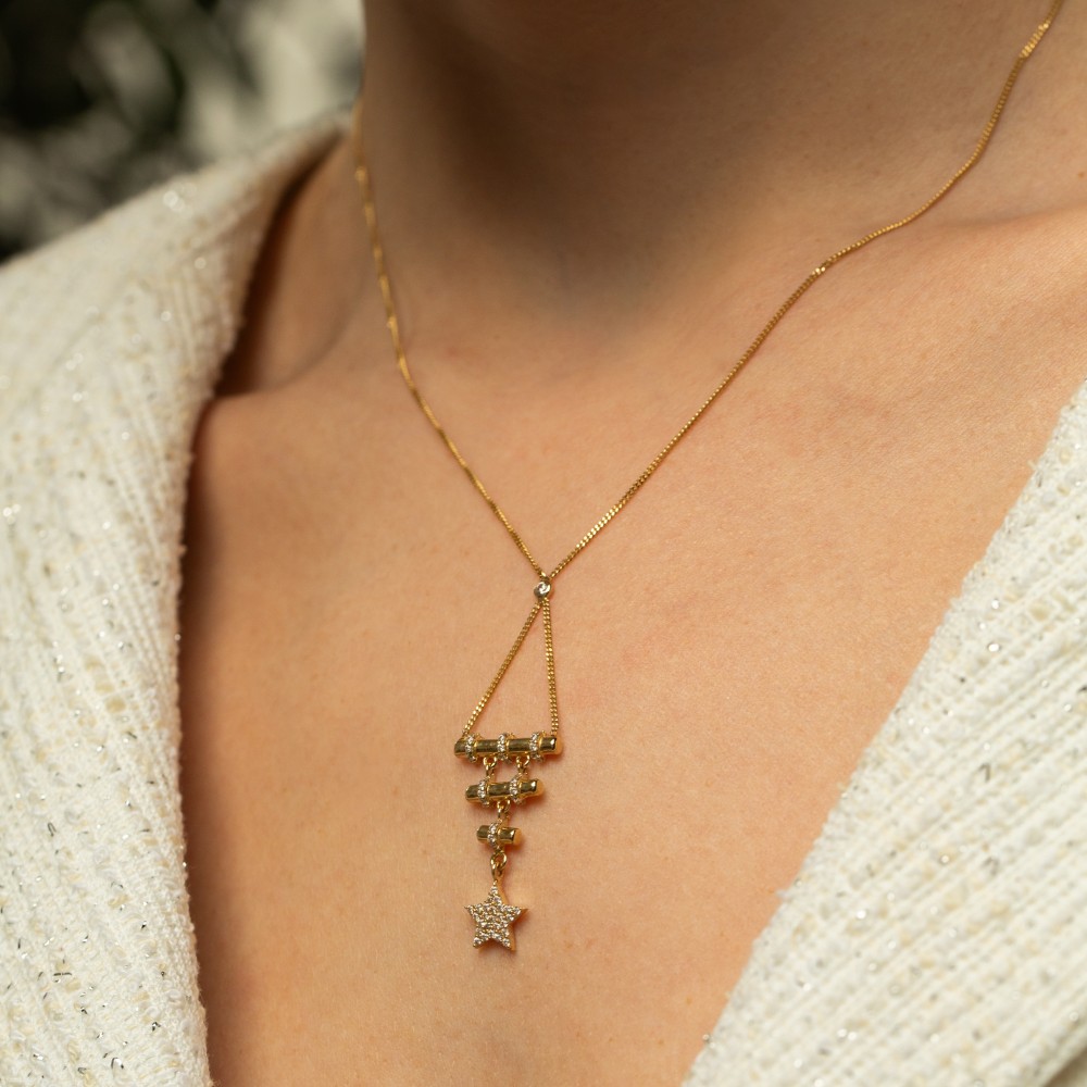 Bu özel tasarım yıldızlı kolye, günlük kombinlerinize zarif bir dokunuş katarken, özel günlerde de göz kamaştırmanızı sağlar. Kendiniz için eşsiz bir aksesuar veya sevdikleriniz için unutulmaz bir hediye arıyorsanız, bu kolye mükemmel bir seçim!