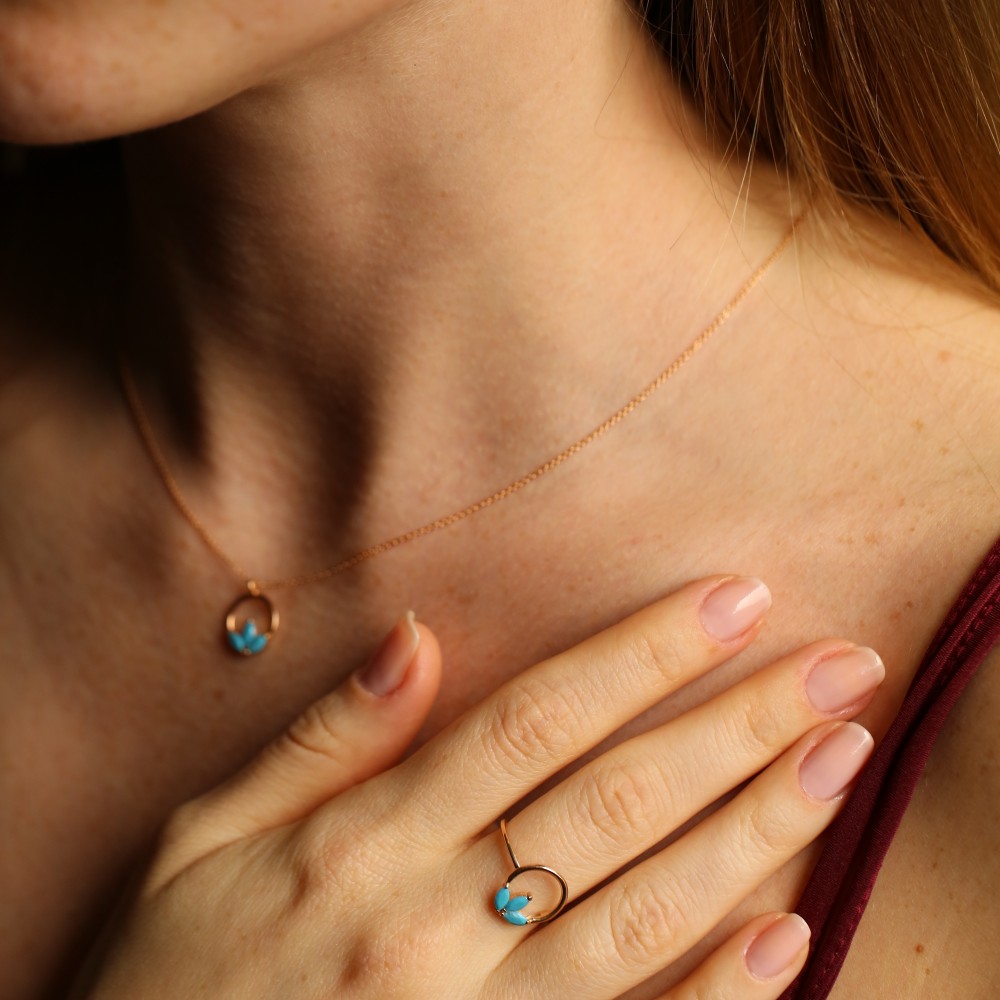 Bu 14 ayar rose altın küpe, markiz kesim firuze taşlarıyla öne çıkarak zarif bir ışıltı ve renk katar. Lotus çiçeği tasarımı, zarif bir sembol sunarken şıklığınızı pekiştirir. Minimalist tasarımı sayesinde her tarzla mükemmel uyum sağlar ve günün her saati kullanabileceğiniz zarif bir parçadır.