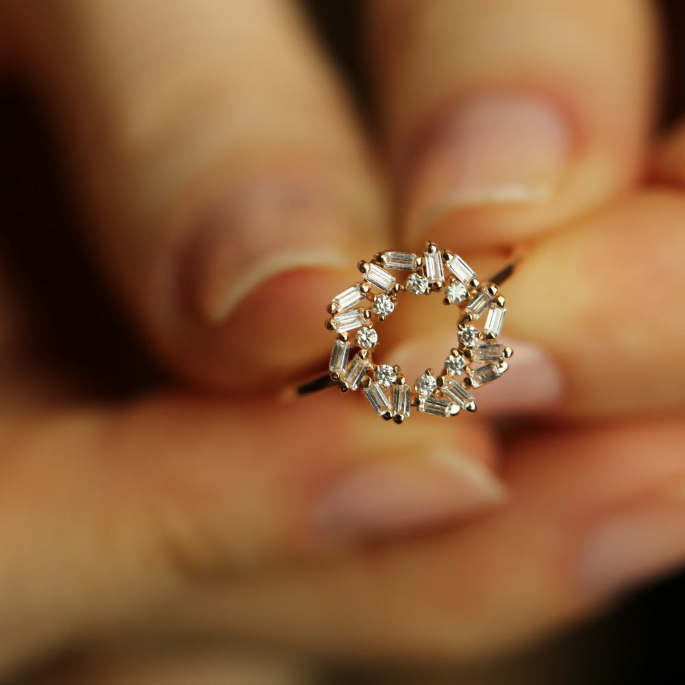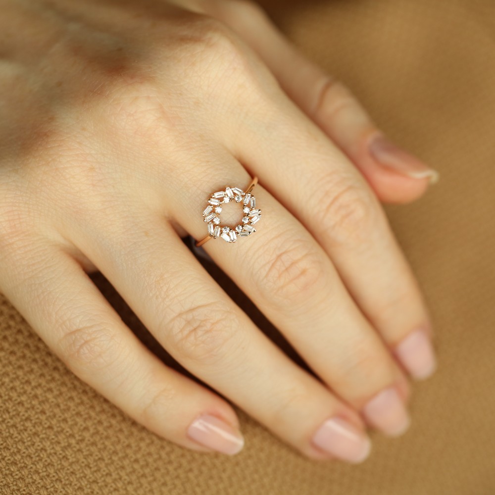 14 Ayar Yeşil Altın Baguet Taşlı Yüzük - Asimetrik Yuvarlak Dizilimli Swarovski Baget Taşlı Şık Yüzük