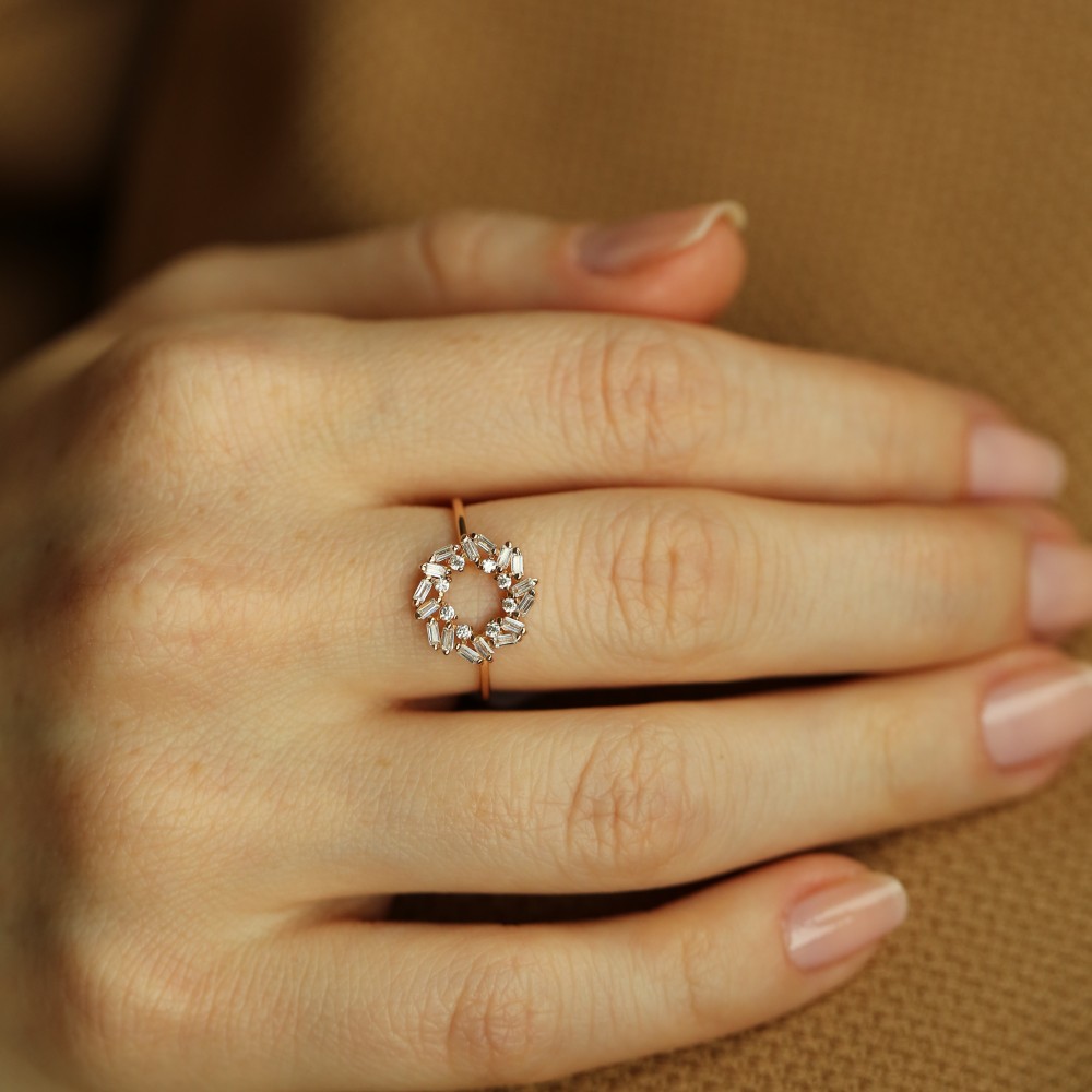 14 ayar yeşil altın ile üretilmiş bu yüzük, Swarovski baget taşlarının zarif ışıltısı ve asimetrik yuvarlak dizilimiyle modern bir estetik yaratır. Taşların mükemmel dizilimi, yüzüğe şıklık ve özgünlük katarken, altın malzeme yüksek kalitesiyle uzun süreli kullanım sunar.