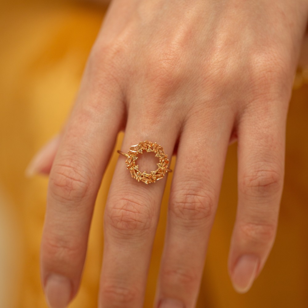 Bu 14 ayar yeşil altın yüzük, Swarovski baget taşlarının ışıltısı ile öne çıkar. Asimetrik yuvarlak dizilim ve balköpüğü renkli taşlar, yüzüğe modern bir estetik ve şıklık katar. Minimalist tasarımı, her tarzla uyum sağlayarak günlük kullanımda da rahatlıkla tercih edilebilir.