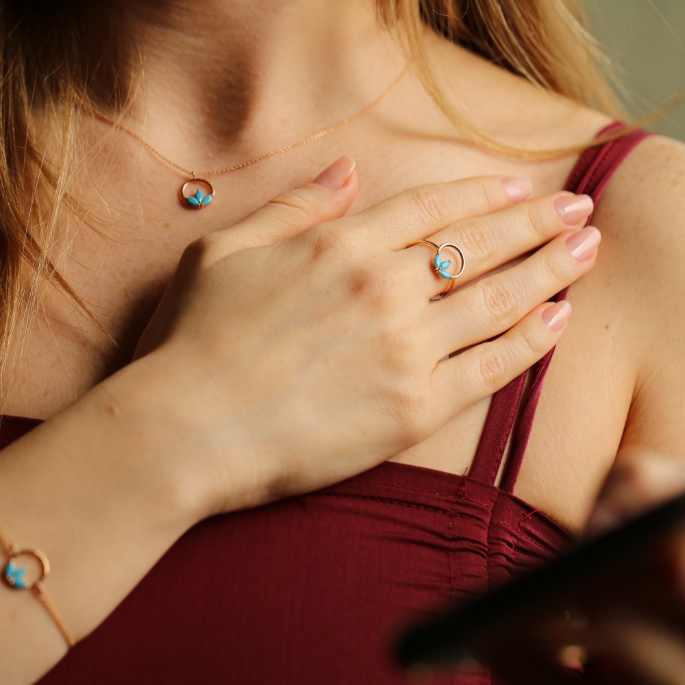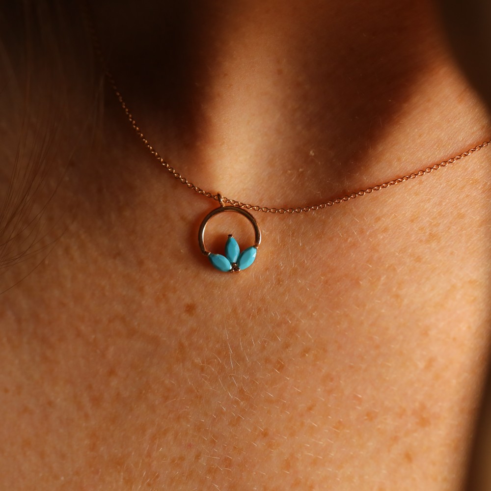 Bu 14 ayar rose altın kolye, markiz kesim firuze taşlarıyla öne çıkarak zarif bir ışıltı sunar. Lotus çiçeği tasarımı, kolyeye anlam katarken şıklığınızı artırır. Minimal tasarım, her tarzla uyum sağlayarak modern ve sofistike bir görünüm elde etmenizi sağlar.