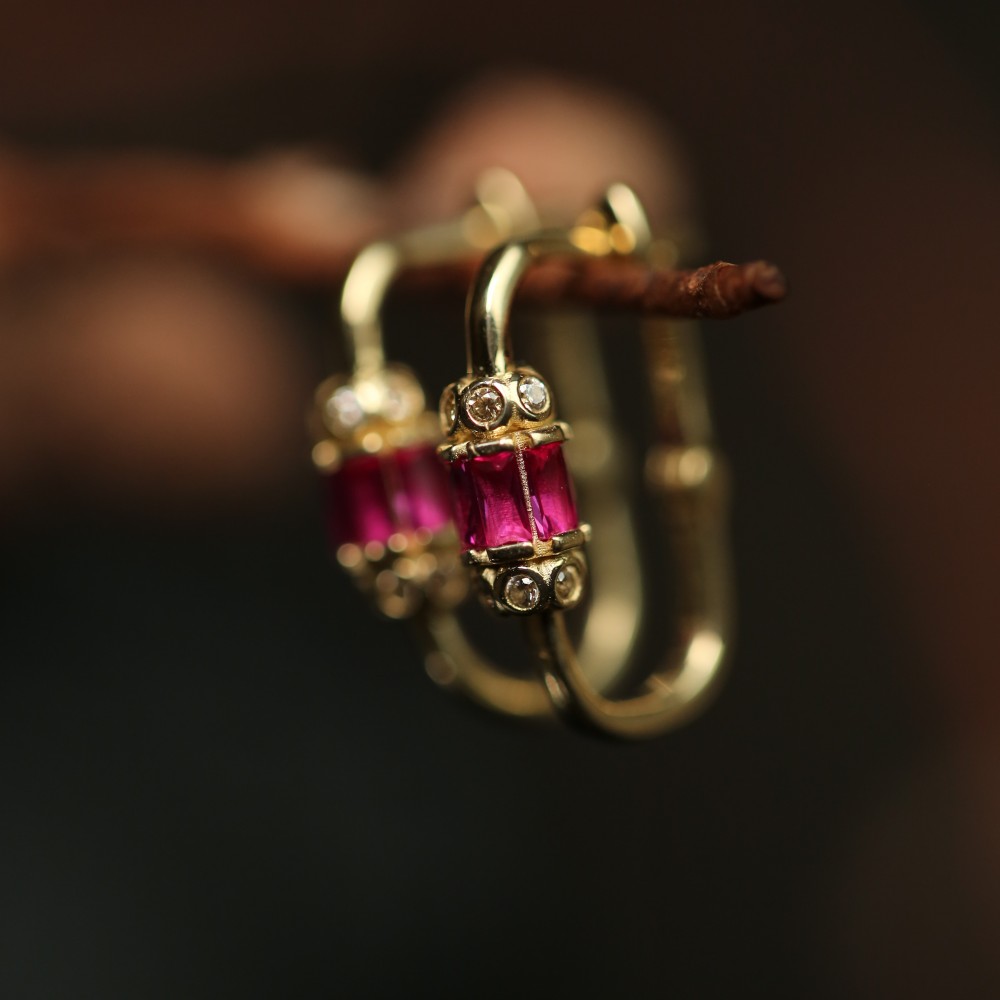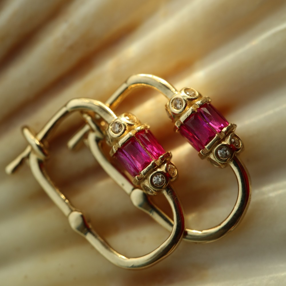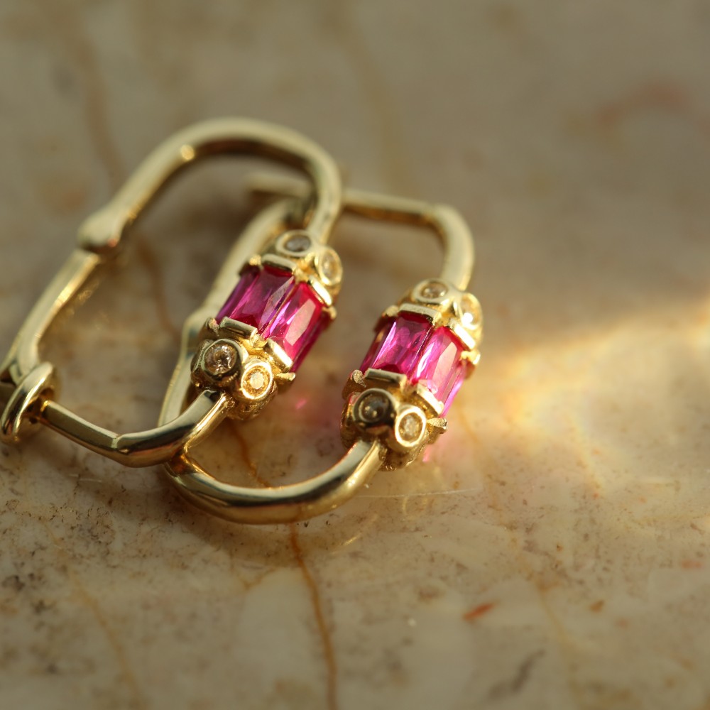 14 ayar yeşil altın ile tasarlanmış olan bu küpe, pembe ve beyaz Swarovski taşları ile modern bir dokunuş katar. Minimal revzen tasarımı sayesinde günlük kullanımda rahatlıkla tercih edilebilir.
