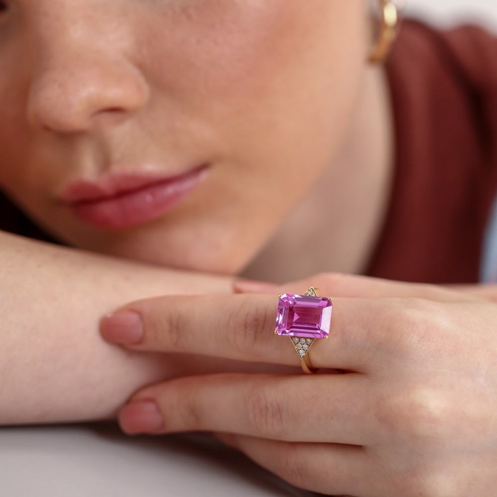 Bu yüzükteki 12.57 karatlık büyük pırlanta taşı, eşsiz büyüklüğüyle göz kamaştırırken, pembe opal taşı da zarif bir renk ve doğal bir şıklık sunar. Pembe opal taşının sıcak ve yumuşak tonu, pırlantaların berraklığıyla mükemmel bir kontrast oluşturur, bu sayede göz alıcı ve sofistike bir tasarım elde edilir.